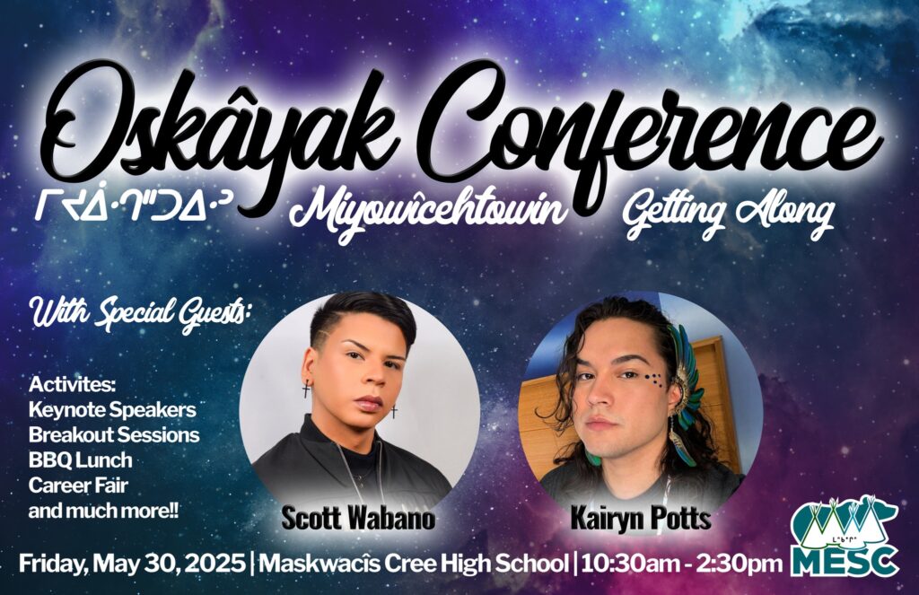 The annual Oskâyak Conference is a closed event exclusively organized for MESC students. This year’s theme is Miyowîcehtowin or “Getting Along,” the Oskâyak Conference brings together all Oskâyak from across MESC schools to recognize their role in shaping the future of education. There will also be interactive break out sessions, games, door prizes, and many opportunities to connect with peers, staff, and community as well as a keynote presentation from special guests Kairyn Potts and Scott Wabano.