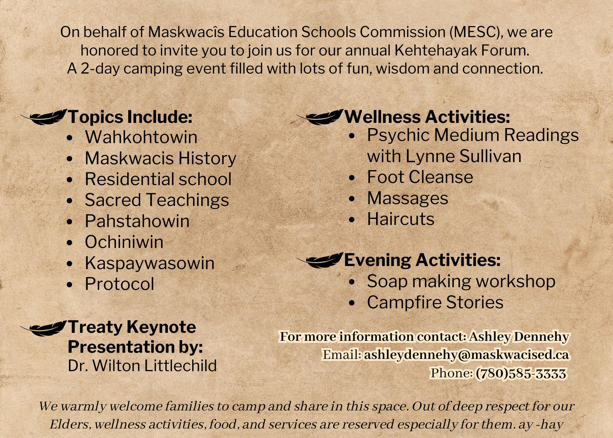For more information, please contact Ashley Dennehy at ashleydennehy@maskwacised.ca or (780) 585-3333.