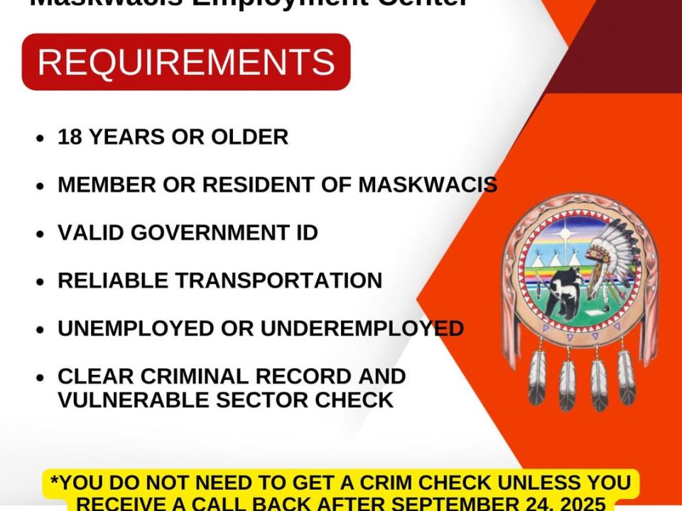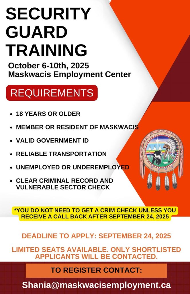 September 11, 2025Published by Erimineskin at September 11, 2025Categories FacebookSecurity Guard Training! October 6-10, 2025. Email shania@maskwacisemployment.ca or call 780-585-4…Security Guard Training! October 6-10, 2025. Email shania@maskwacisemployment.ca or call 780-585-4450 to apply. Source