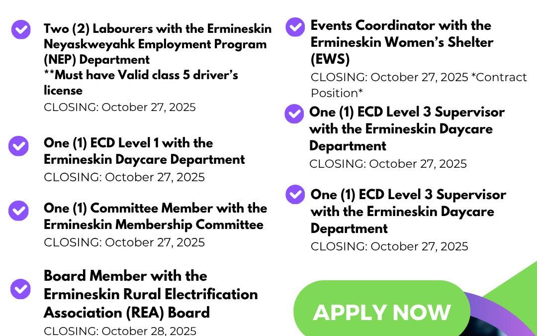 Published by Erimineskin at October 17, 2025 Categories Facebook Tags Commenting has been turned off for this post. Source Share0 Related postsOctober 17, 2025Submit your applications, resumes and criminal record check to the ECN Personnel Department: faith@e…Read moreOctober 17, 2025We’re Hiring a Journeyman Mechanic! Join our team at Maskwacîs Education Schools Commission and put…Read moreOctober 17, 2025Event Details: Thursday, October 23, 2025 Howard Buffalo Memorial Center, Maskwacis, Alberta 10 am…Read moreOctober 16, 2025What a fantastic couple of days at the Kanawemahwasowin Kamik elders gathering! It was time well spe…Read more