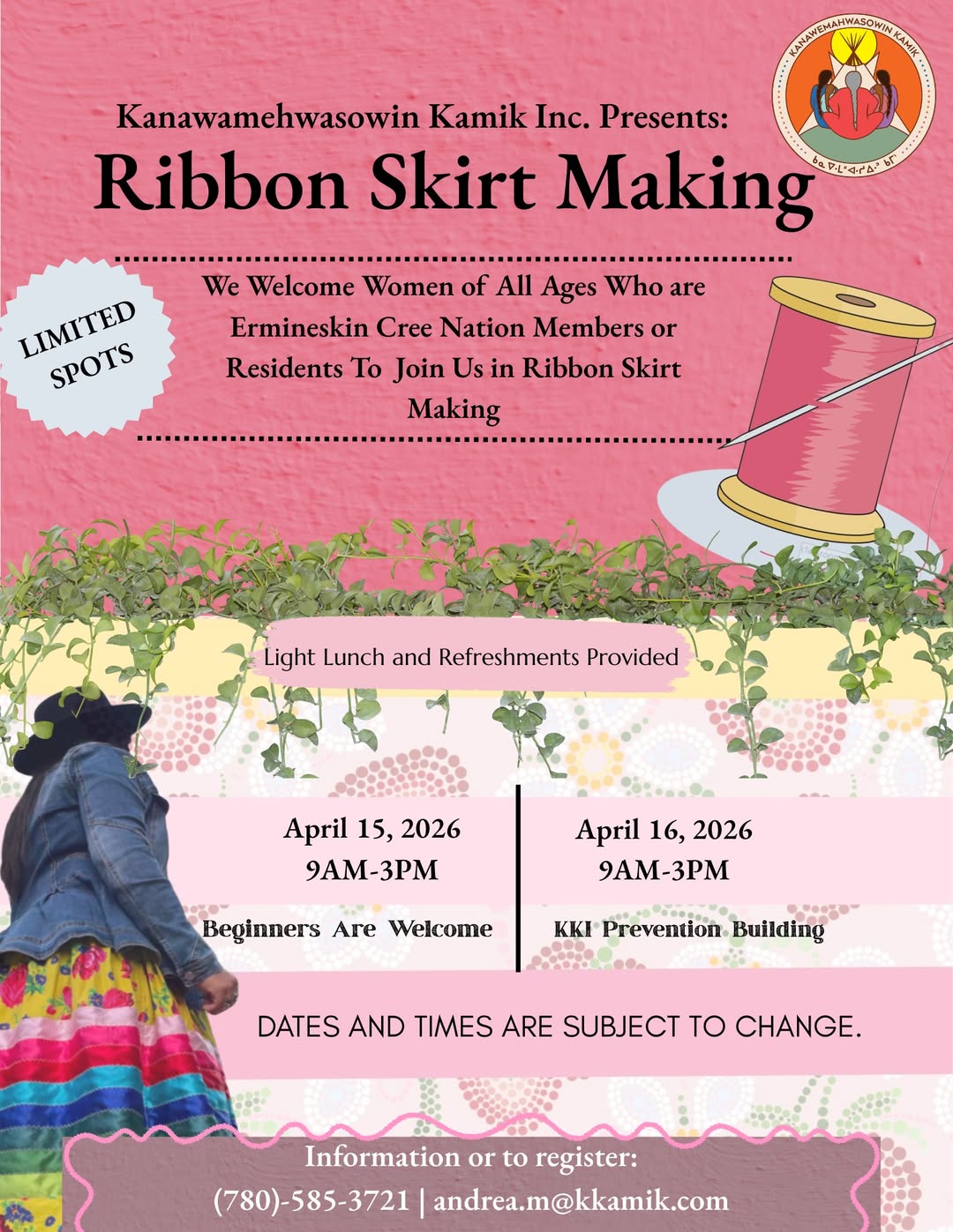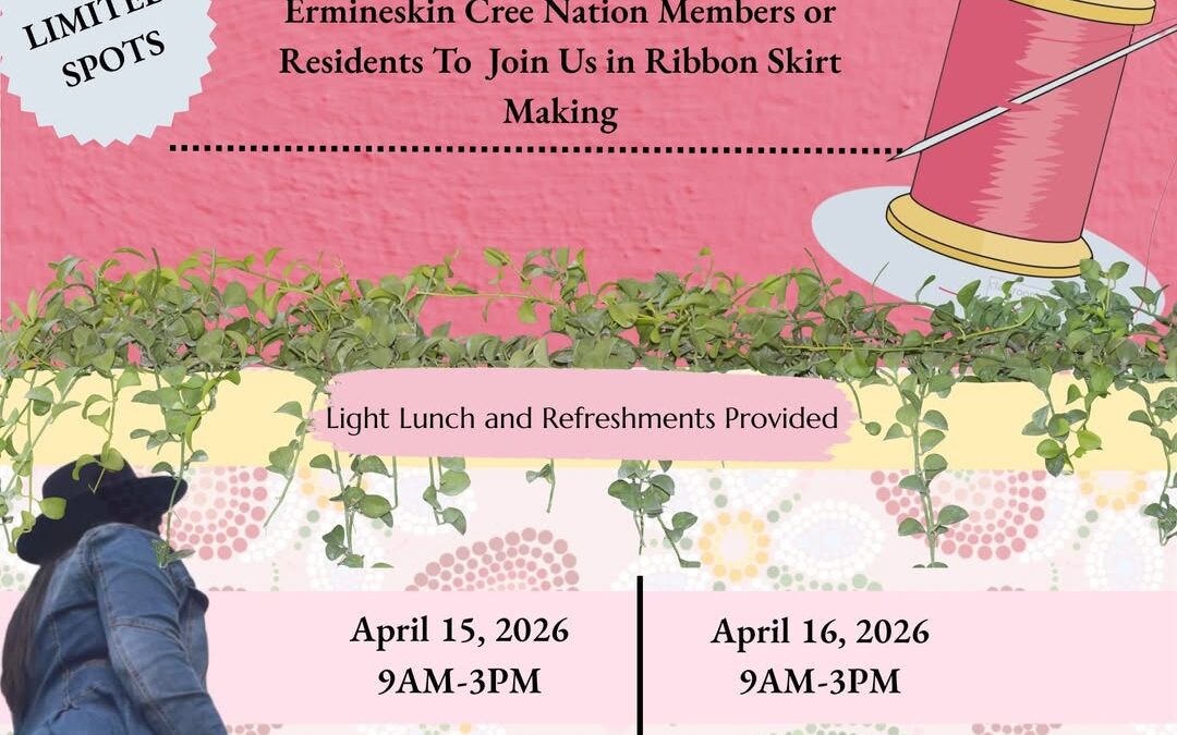Contact Andrea to Register for the 2-Day Ribbon Skirt Making class | andrea.m@kkamik.com | 780-585-3721 | April 15-16, 2026 | 9:00AM-3:00PM