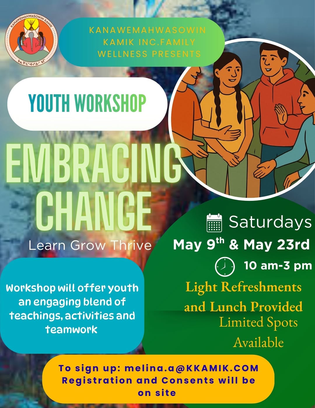 Contact Melina to Register for the Embracing Change Youth Workshop | melina.a@kkamik.com | 780-585-3…