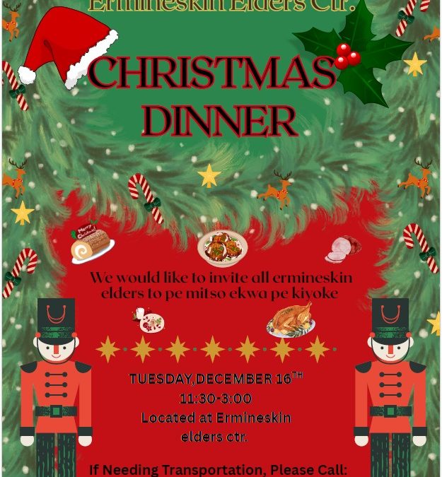 ELDERS CHRISTMAS DINNER Ermineskin Elders Centre December 16, 2025 11:30am-3:30pm If you need tr…