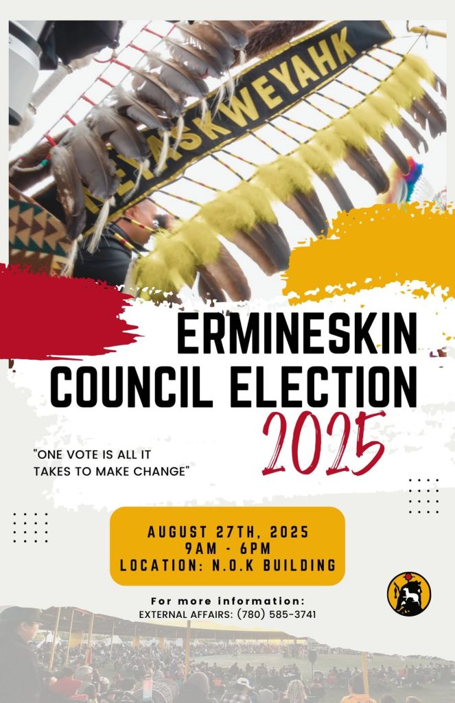 Published by Erimineskin at August 6, 2025 Categories Facebook Tags Ermineskin Council Election 2025 August 27th, 2025 9am – 6pm Location: N.O.K Building Source Share0 Related postsApril 18, 2026Treaty 6 Reign with a dominant 7–0 win over Paddle Prairie! Next game is at 7:15 PM — if you’re at…Read moreApril 18, 2026Congratulations to the Neyaskweyahk (18+) Men’s Team on your impressive 7-0 victory over the Sturgeo…Read moreApril 18, 2026Good luck to all the teams competing at the Alberta St. native Provincials!Read moreApril 17, 2026It was a tough loss for the Senior Men’s (35+) Neyaskweyahk team in a hard-fought game tonight. The …Read more