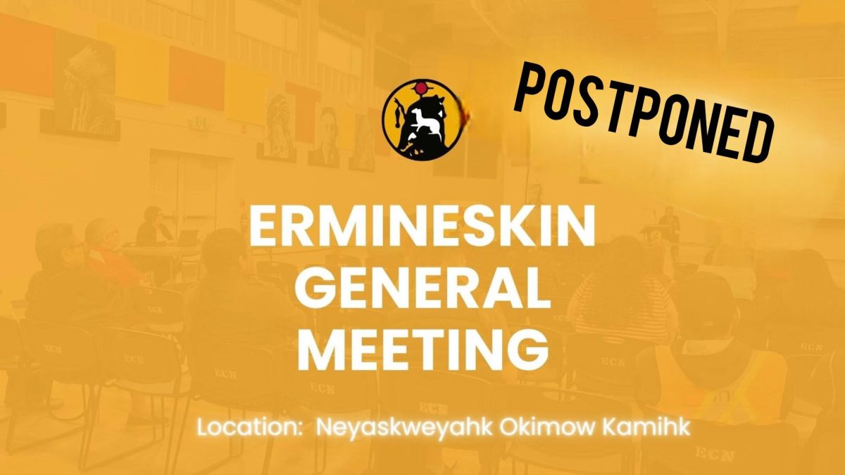 Published by Erimineskin at September 25, 2025 Categories Facebook Tags Ermineskin General Meeting has been postponed. New Date TO BE ANNOUNCED.  Source Share0 Related postsOctober 23, 2025Ermineskin Recreation: SPOOKAPALOOZA – Halloween Dance Party Thursday, October 30, 2025 N.O.K. Buil…Read moreOctober 22, 2025MASKWACIS EMPLOYMENT CENTRE – JOB FAIR – OCT 23 Happening at the H.B.M.C. THURSDAY OCTOBER 23RD, 202…Read moreOctober 22, 2025Measles Awareness and Prevention: Tansi Ohpikinahawasiwak (Parents/Caregivers), At Maskwacîs Educati…Read moreOctober 22, 2025Rock your Mocs Colouring Contest! Pick up colouring pages at KKI Prevention building or email Andrea…Read more