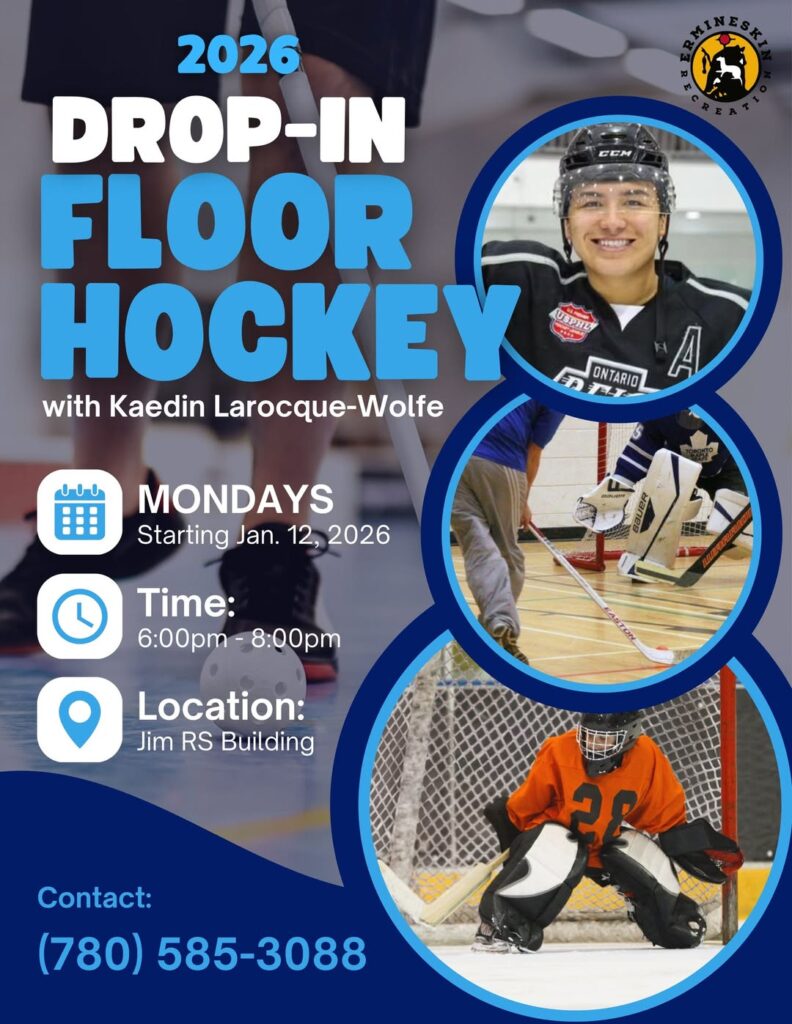 Ermineskin Recreation DROP-IN FLOOR HOCKEY with Kaedin Larocque-Wolfe Monday’s (Starting Jan 12/26) …