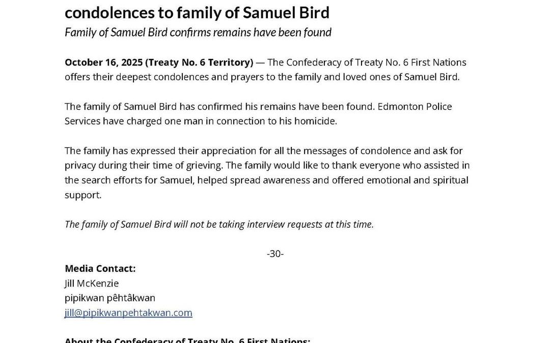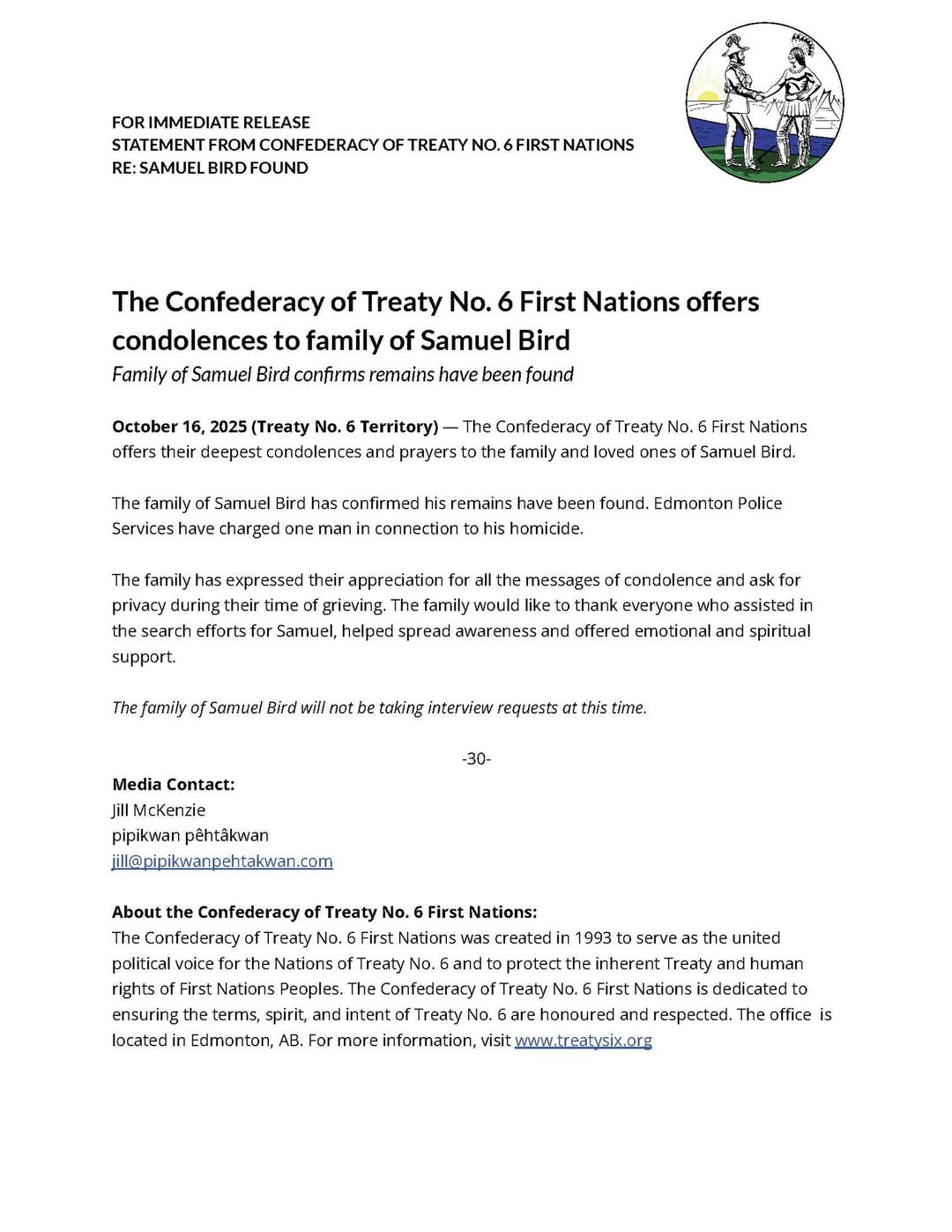 Published by Erimineskin at October 16, 2025 Categories Facebook Tags FOR IMMEDIATE RELEASE The Confederacy of Treaty No. 6 First Nations offers condolences to family of Samuel Bird Source Share0 Related postsOctober 17, 2025Submit your applications, resumes and criminal record check to the ECN Personnel Department: faith@e…Read moreOctober 17, 2025Commenting has been turned off for this post.Read moreOctober 17, 2025We’re Hiring a Journeyman Mechanic! Join our team at Maskwacîs Education Schools Commission and put…Read moreOctober 17, 2025Event Details: Thursday, October 23, 2025 Howard Buffalo Memorial Center, Maskwacis, Alberta 10 am…Read more