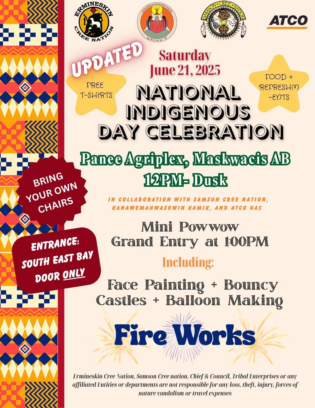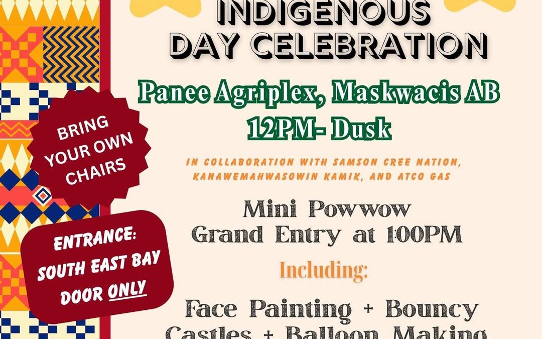 Due to forecasted poor weather, the Indigenous Day Celebrations have been moved to the PANEE AGRIPLEX. Entrance into the building will be the SOUTH EAST BAY DOOR ONLY.