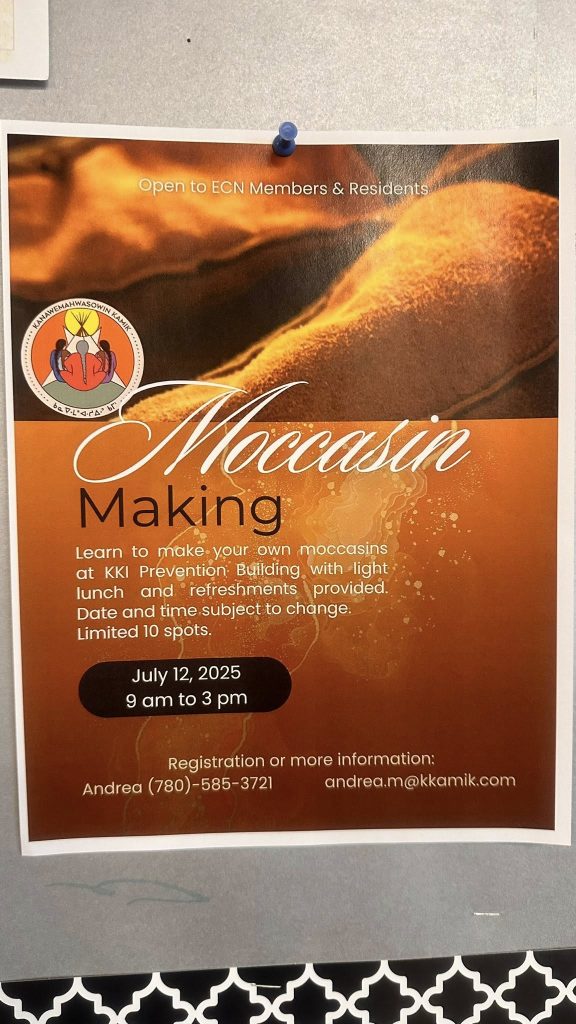 Published by Erimineskin at July 12, 2025 Categories Facebook Tags KKI Moccasin Making facilitated by Carolyn Omeasoo. Photos by: Tara Cutarm Ermineskin Communications Source Share0 Related postsNovember 18, 2025Community members, you are invited to our Diabetes Education Gala! Doors open at 1:00pm today You a…Read moreNovember 18, 2025Please contact Andrea for registration at Andrea.M@kkamik.comRead moreNovember 18, 2025Commenting has been turned off for this post.Read moreNovember 18, 2025Ermineskin Cree Nation Gift Baskets – Important Update! Pick-Up Day: Friday, December 19, 2025 T…Read more
