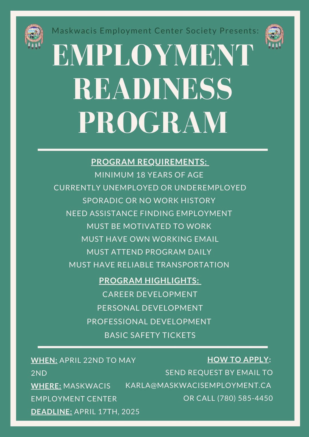 Maskwacis Employment Center We have an upcoming Employment Readiness Program happening this month! …