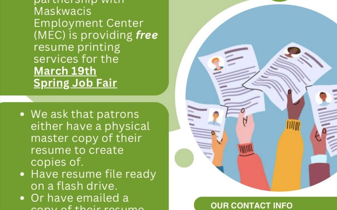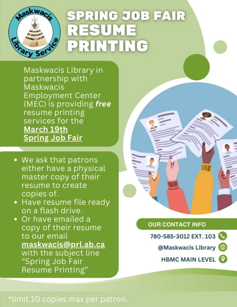 Maskwacis Library Service in partnership with Maskwacis Employment Center is providing FREE resume printing services for the March 19th Spring Job Fair!