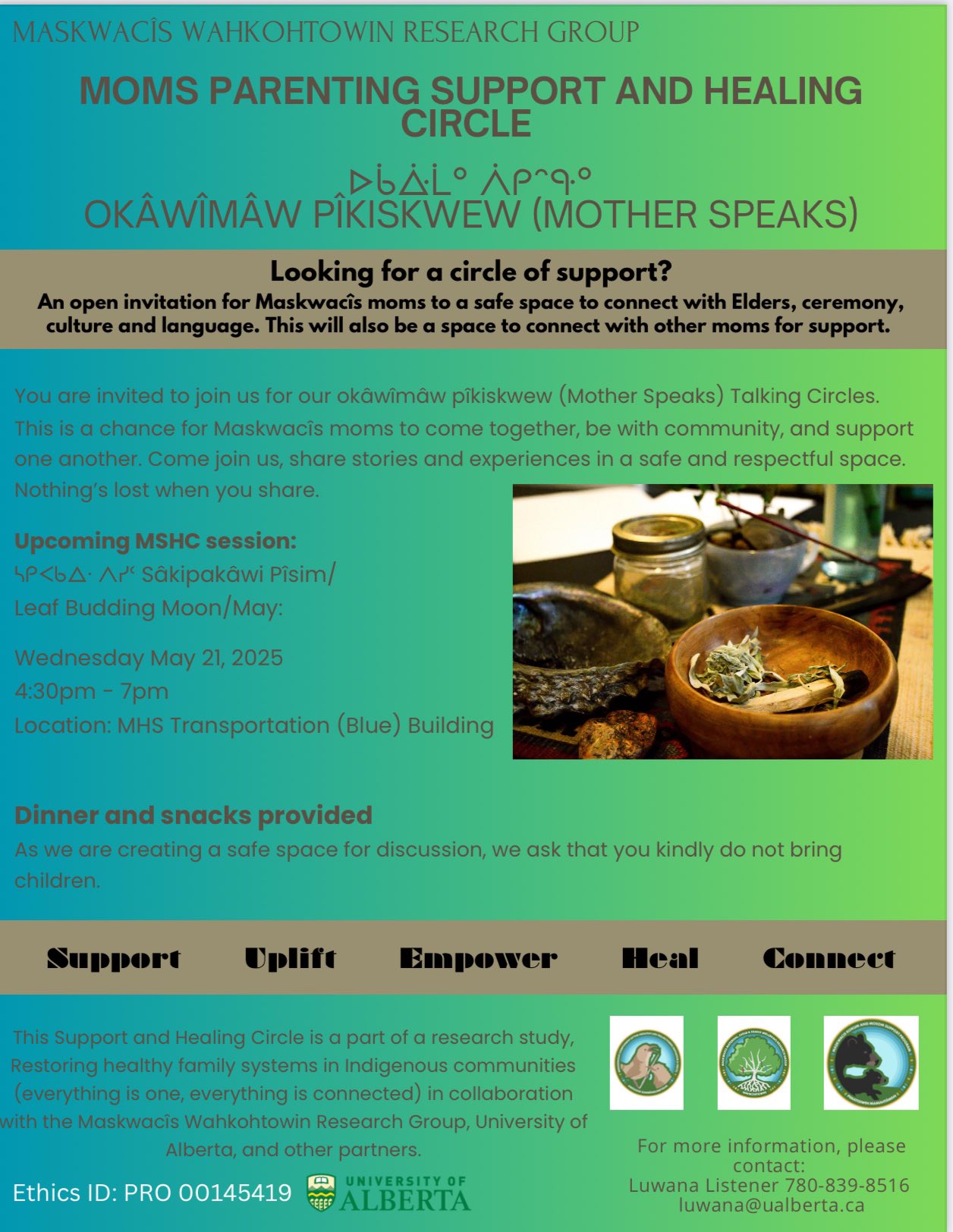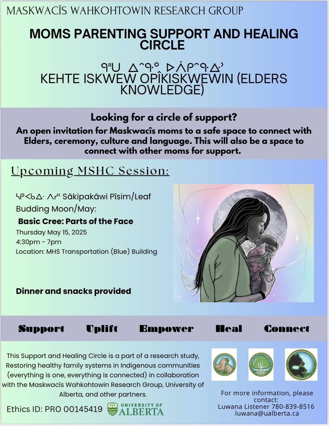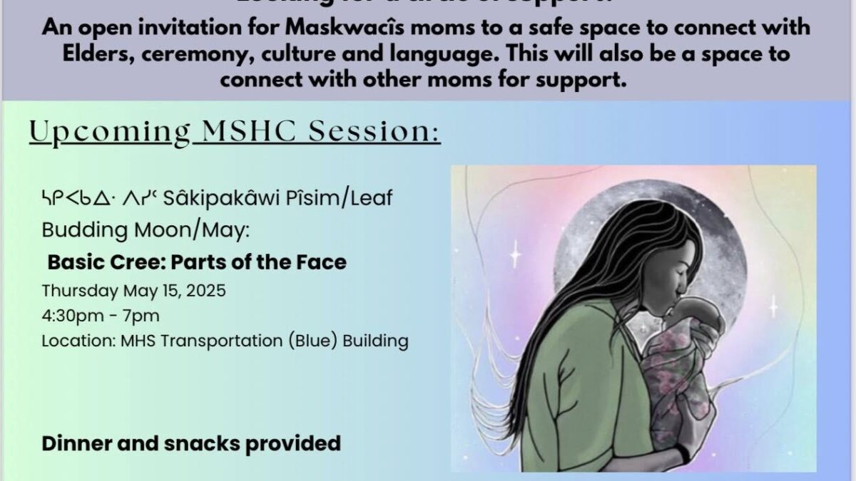 Maskwacîs moms join us this Thursday May 15th and next week Wednesday May 21st. Come visit, sit with other moms &Elders to learn and share. For more info txt us at 780-913-5341 or 780-839-8516