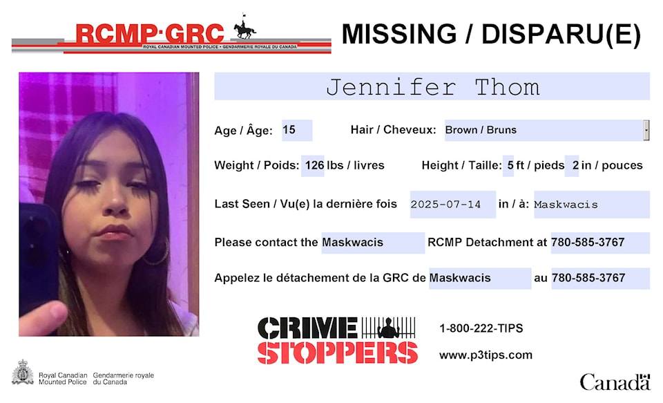 Makwacis RCMP is requesting the public’s help in locating missing 15-year-old Jennifer Winnie Thom. Jennifer was last seen on July 14 in Maskwacis. Her family is concerned for her well being, according to a release.