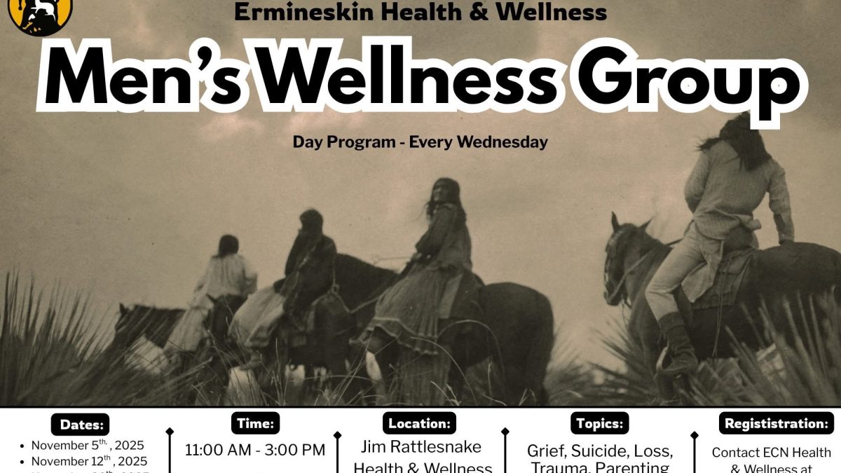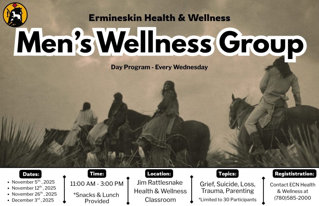 Published by Erimineskin at November 24, 2025 Categories Facebook Tags Men’s Wellness Group This Wednesday. Source Share0 Related postsNovember 25, 2025The Jim Rattlesnake Building will be closed From Tuesday to Friday Nov. 25-28, 2025. All schedul…Read moreNovember 25, 2025Ermineskin Christmas Community Dinner! We welcome all to enjoy a meal and entertainment to celebra…Read moreNovember 24, 2025Commenting has been turned off for this post.Read moreNovember 24, 2025LAST WEEK OF NOVEMBER! Here’s how you can make it count! MONDAY – Seniors Day Free coffee & sna…Read more