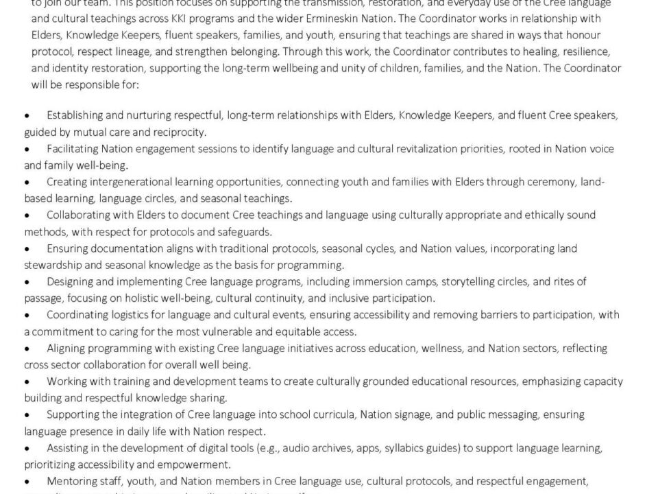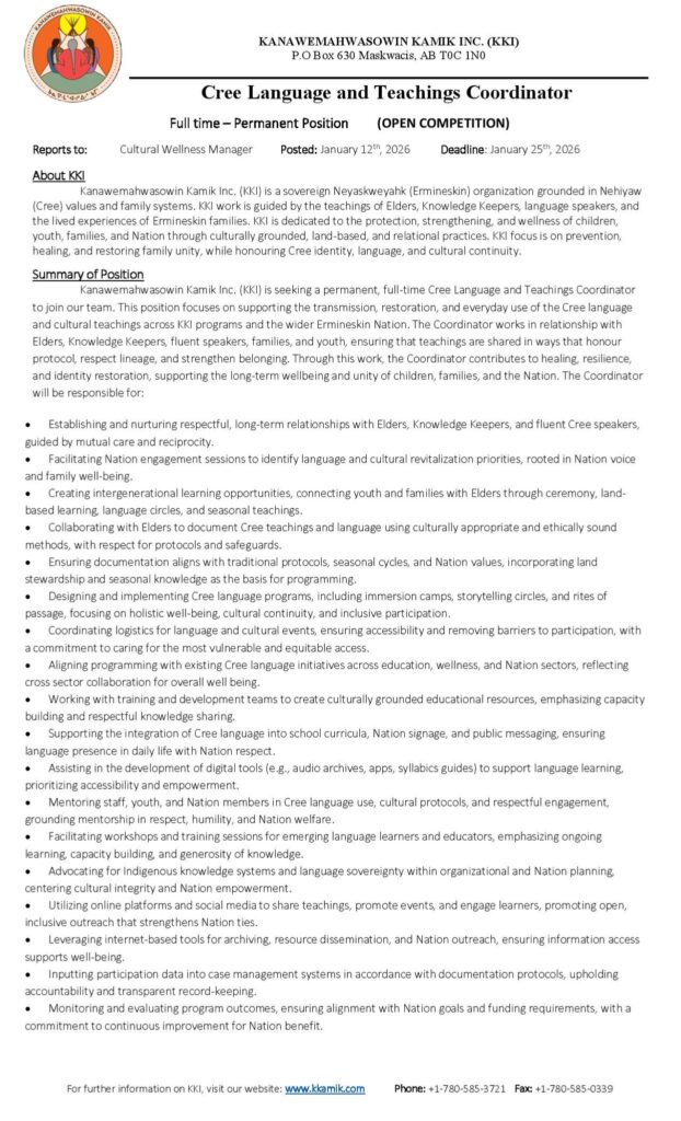 Cree Language and Teachings Coordinator – Open Competition Deadline: January 25, 2026 Submit Resume …