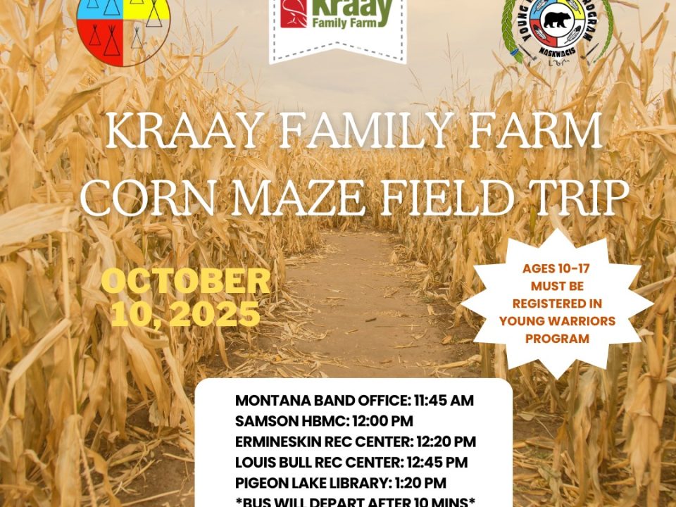 October 7, 2025Published by Erimineskin at October 7, 2025Categories FacebookWe’re excited to invite Maskwacis youth aged 10-17 to a fun field Corn Maze trip adventure at the Kr…We’re excited to invite Maskwacis youth aged 10-17 to a fun field Corn Maze trip […]