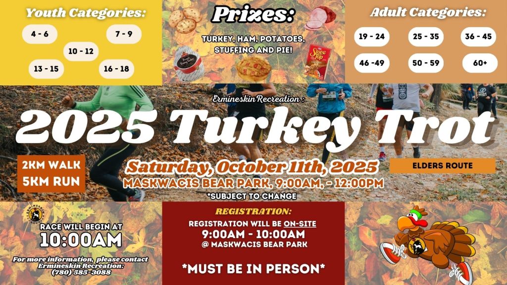 October 7, 2025Published by Erimineskin at October 7, 2025Categories FacebookErmineskin Recreation: 2025 Turkey Trot October 11th, 2025 Maskwacis Bear Park 9:00am Registration…Ermineskin Recreation: 2025 Turkey Trot 📅 October 11th, 2025 📍Maskwacis Bear Park 🕒 9:00am Registration […]