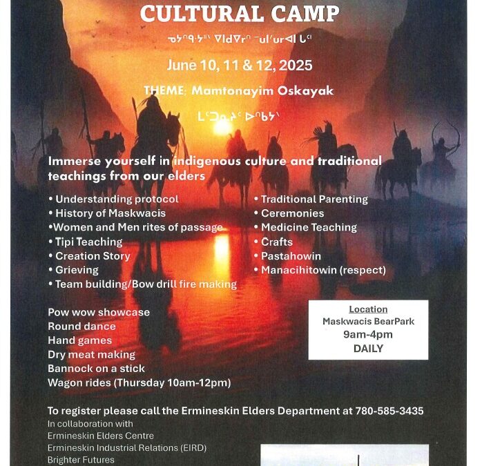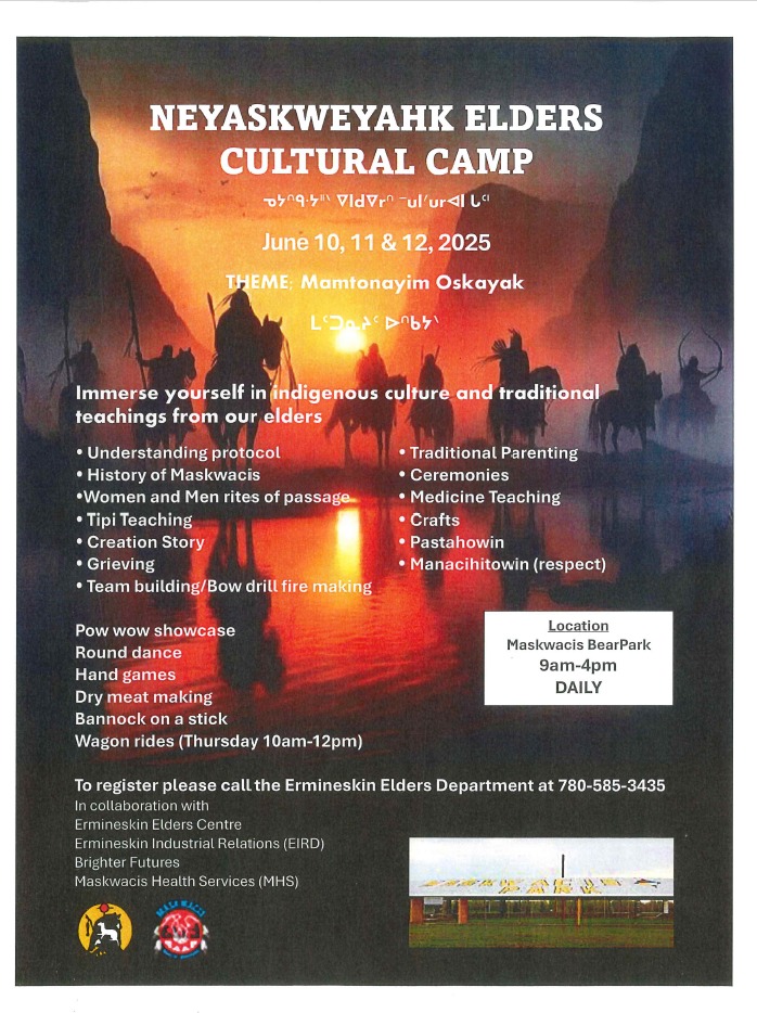 Published by Erimineskin at June 9, 2025 Categories Facebook Tags Neyaskweyahk Cultural Camp is open to the Neyaskweyahk Public. June 10, 11, &12th, 2025. Source Share0 Related postsApril 16, 2026Submit your applications, resumes and criminal record check to the ECN Personnel Department: faith@e…Read moreApril 16, 2026Commenting has been turned off for this post.Read moreApril 15, 2026PLEASE BE ADVISEDRead moreApril 15, 2026Congratulations to all of our athletes who competed in the AB Native Provincials and the Alberta Tre…Read more