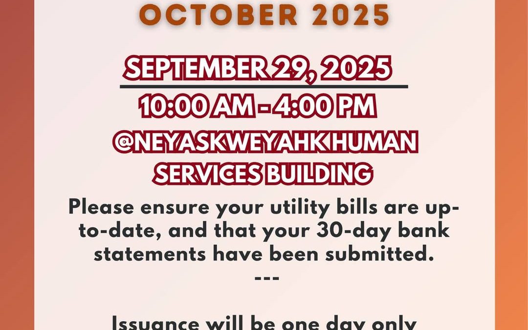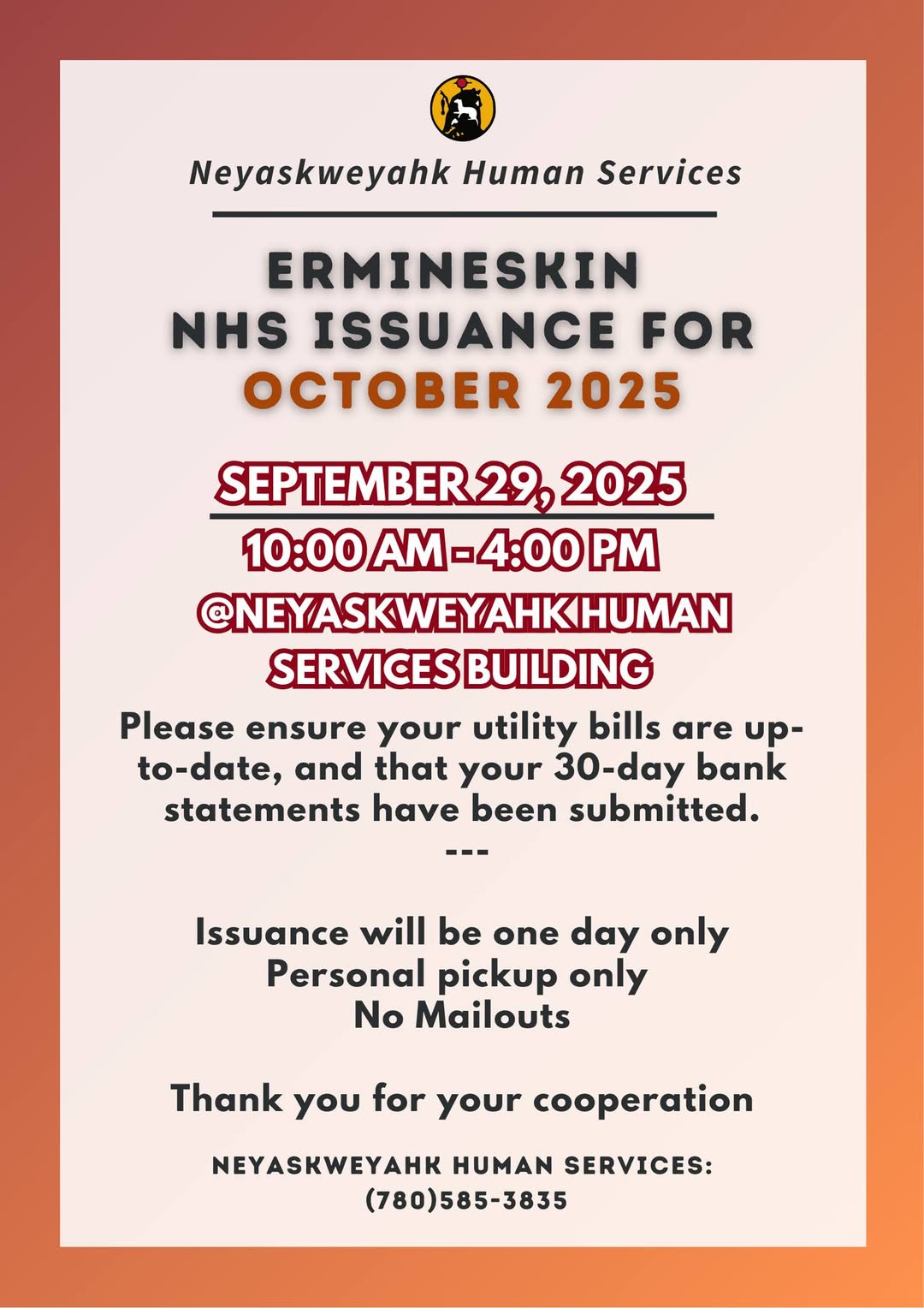 Published by Erimineskin at September 23, 2025 Categories Facebook Tags Neyaskweyahk Human Service’s October Issuance: đź“…September 29, 2025 📍NHS Building đź•’10am-4pm Source Share0 Related postsOctober 23, 2025OILERS TICKET GIVEAWAY! The Edmonton Oilers have graciously donated tickets to TONIGHTS game for s…Read moreOctober 23, 2025My girls made Halloween lanternsRead moreOctober 23, 2025Danielle Lightning is a proud Ojibwe/ Cree woman from Ermineskin Cree Nation of Maskwacis, Alberta. …Read moreOctober 23, 2025Next week is full of tricks and treats! We are celebrating all week in different ways! Join in on on…Read more
