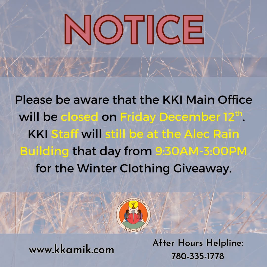 HOWEVER, The Clothing Giveaway will STILL BE OPERATING and there will be staff at the Alec Rain Building (north of K&M Foods in Samson) from 9:30AM-3:00PM.
