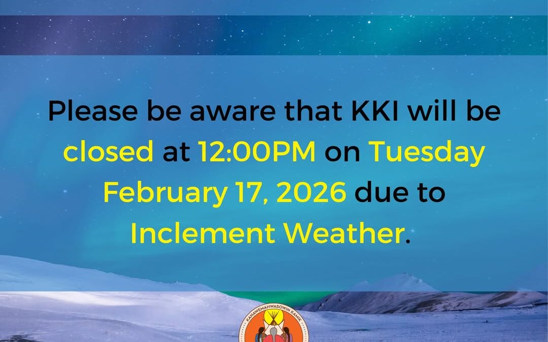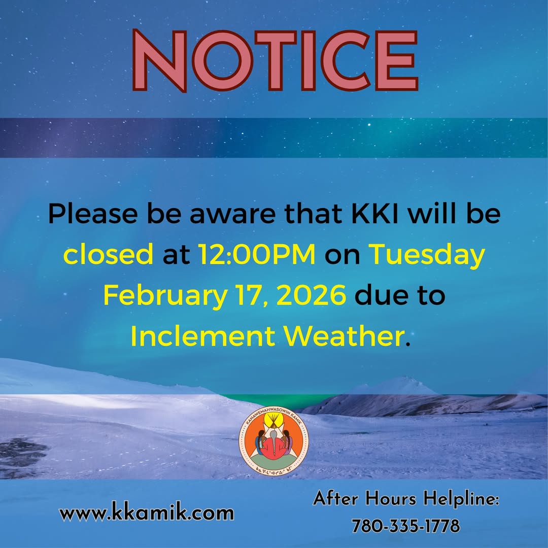 Published by Erimineskin at February 17, 2026 Categories Facebook Tags NOTICE: KKI will be closing today at 12:00PM due to inclement weather Please travel safely! Source Share0 Related postsApril 16, 2026Submit your applications, resumes and criminal record check to the ECN Personnel Department: faith@e…Read moreApril 16, 2026Commenting has been turned off for this post.Read moreApril 15, 2026PLEASE BE ADVISEDRead moreApril 15, 2026Congratulations to all of our athletes who competed in the AB Native Provincials and the Alberta Tre…Read more