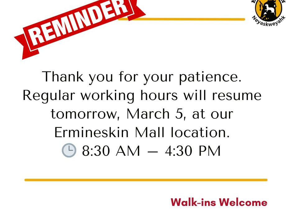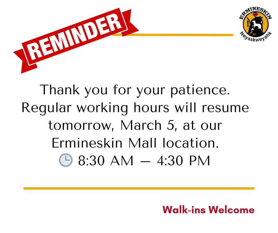 Office Notice Regular office hours resume March 5 Location: Ermineskin Mall (Temporary Office) H…