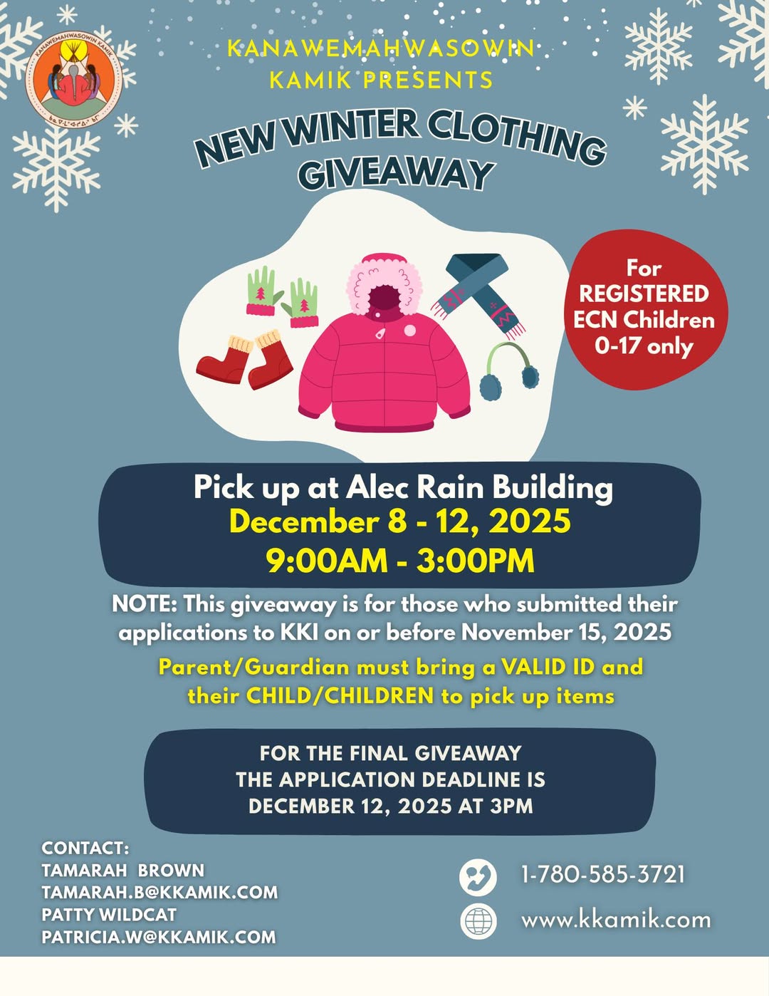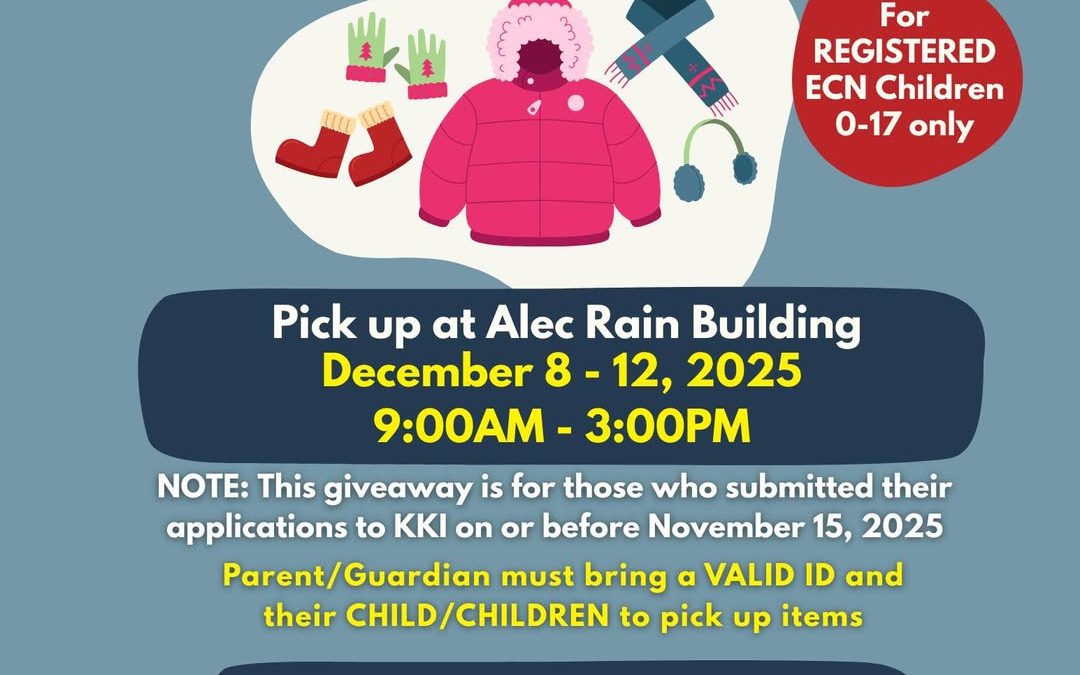 Pick-up dates for New Winter Clothing! December 8-12, 2025 at the Alec Rain Building (just North of …