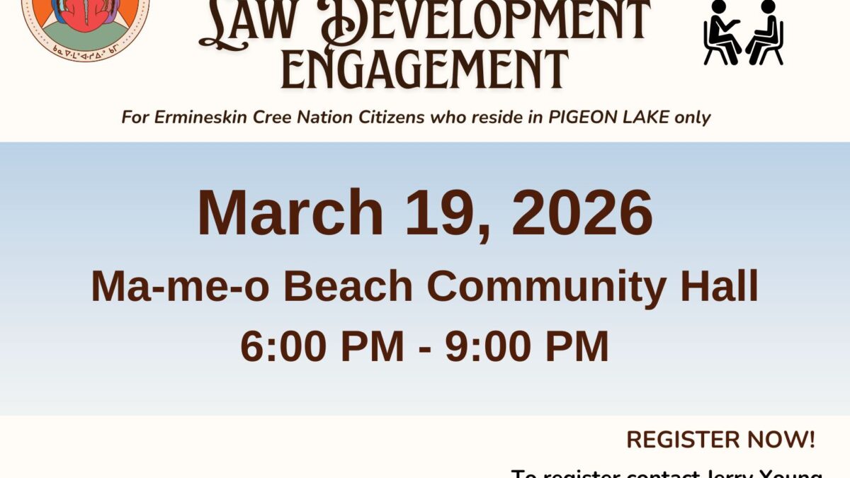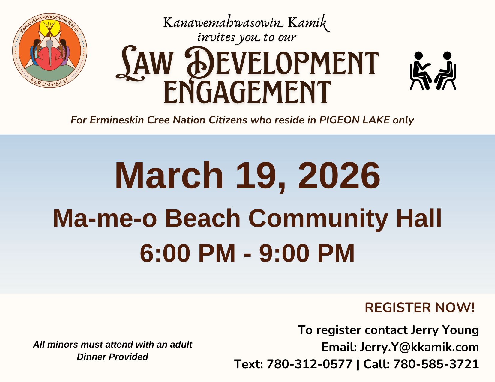Pigeon Lake Law Development Engagement March 19, 2026 Contact Jerry to register! jerry.y@kkamik.com …