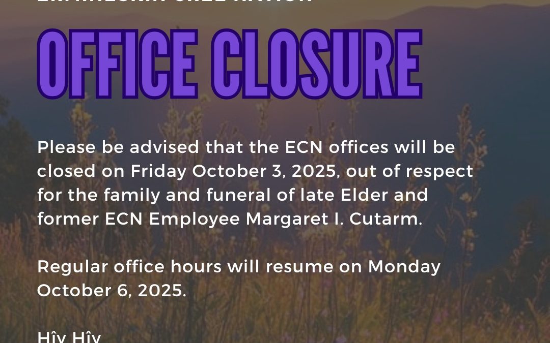 Please be advised that the ECN offices will be closed on Friday, October 3, 2025, out of respect for the family and funeral of late Elder and former ECN Employee Margaret I. Cutarm.