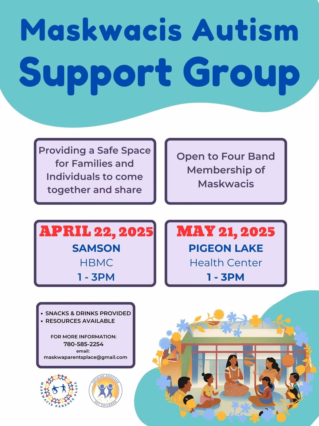 Please join is next week for our monthly Autism Support Group. We will be in the classroom of the HBMC on Tuesday April 22, 2025 from 1 – 3pm. In May, we will be at the Pigeon Lake Health Center 🙂