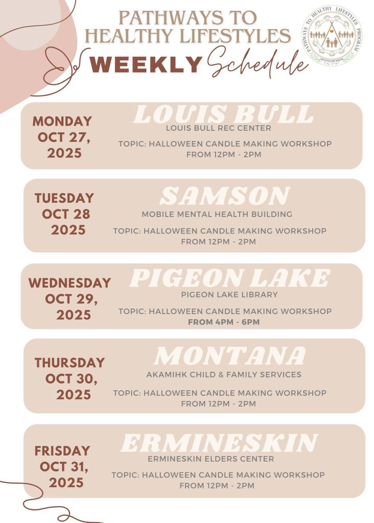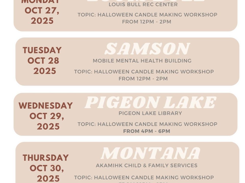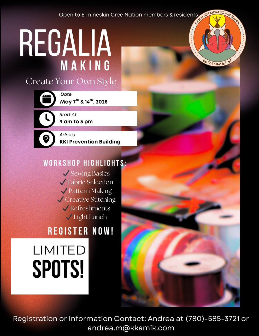 Published by Erimineskin at May 2, 2025 Categories Facebook Tags Regalia Making May 7th and 14th 9AM to 3PM To register contact Andrea 780-585-3721 andrea.m@kkamik.com Source Share0 Related postsOctober 23, 2025Next week’s schedule of where we will be with times and locations for our Halloween Candle Making Wo…Read moreOctober 23, 2025CAREER OPPORTUNITY: Join the MESC Team! Maskwacis Education Schools Commission (MESC) is looking for…Read moreOctober 23, 2025Congratulations t Hunting Moon Powwow 2025 Youth Singing Champions KRAZY BEAR!! Photo by: Martha De…Read moreOctober 23, 2025Ermineskin Recreation: SPOOKAPALOOZA – Halloween Dance Party Thursday, October 30, 2025 N.O.K. Buil…Read more