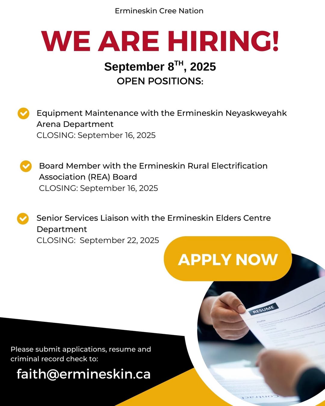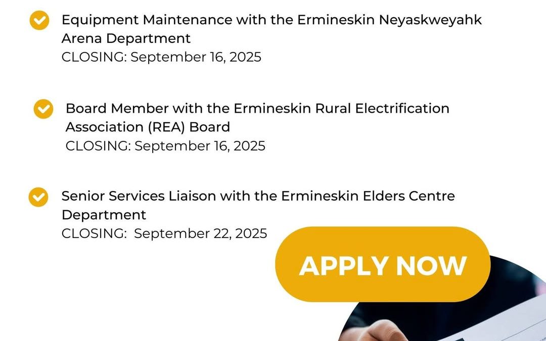Submit your applications, resume and criminal record check to the ECN Personnel Department: faith@ermineskin.ca