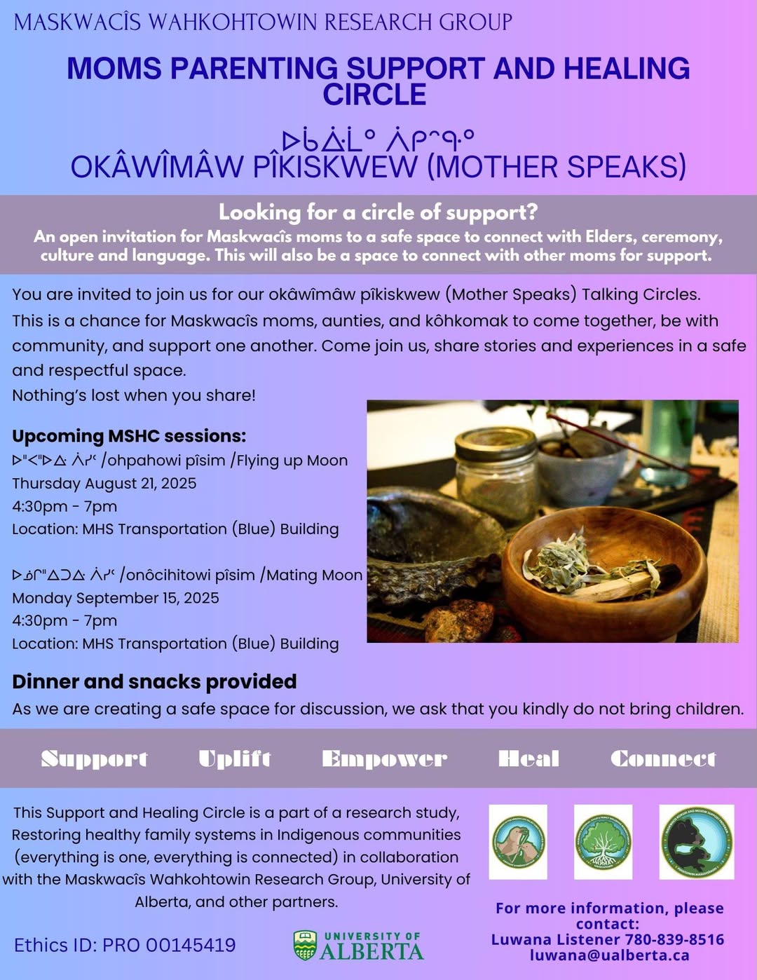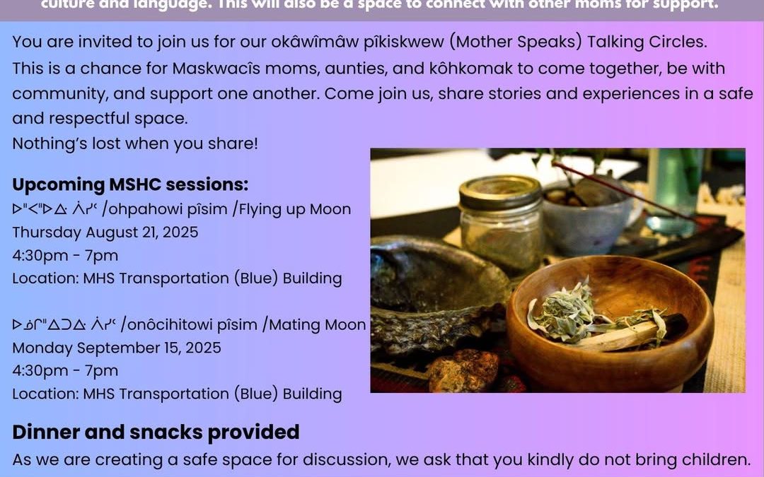 This is a chance for Maskwacis moms, aunties, and kôhkomak to come together, be with community, and support one another. Come join us, share stories and experiences in a safe and respectful space.
