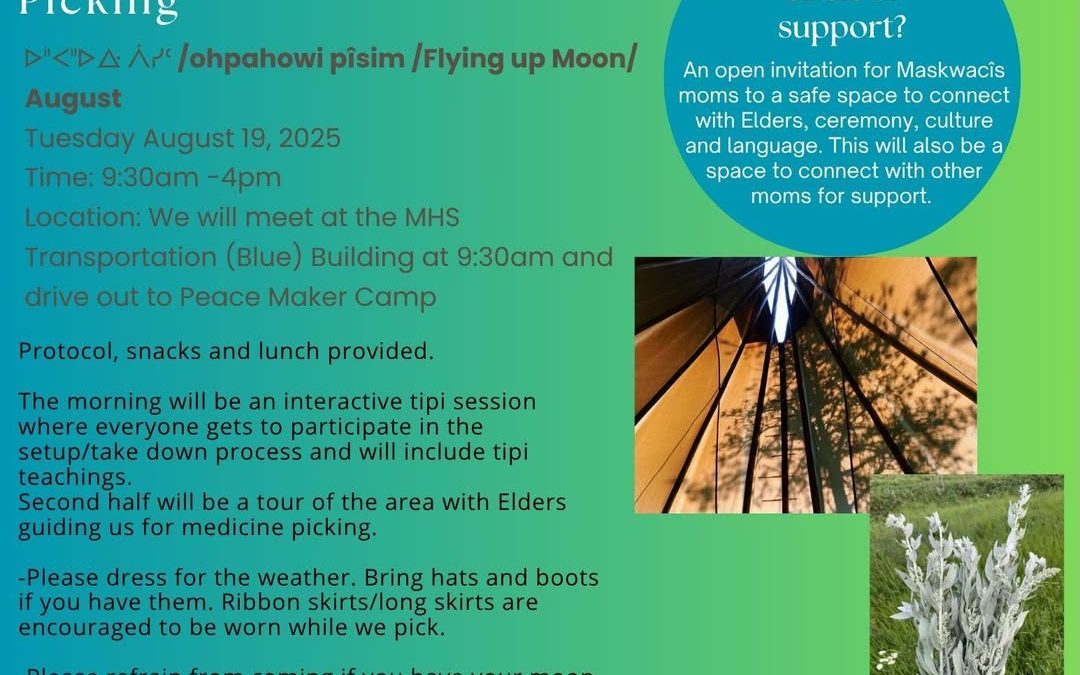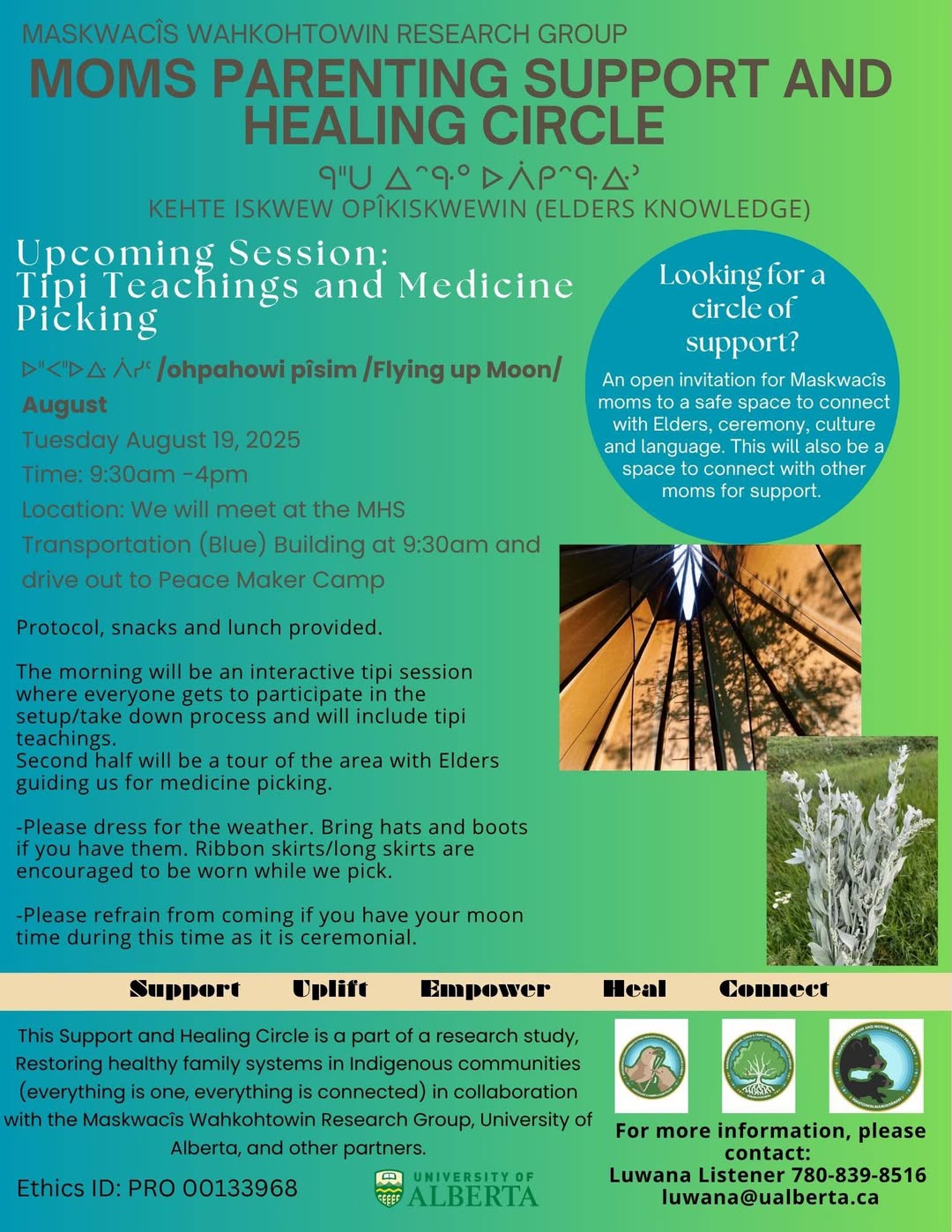 The Moms Support and Healing Circle (MSHC) is holding an upcoming session! Join us on Tuesday August 19th for a day of land based teachings. We will learn how to set up a tipi and hear tipi teachings in the morning and have a medicine picking tour of the area with Elders in the afternoon.