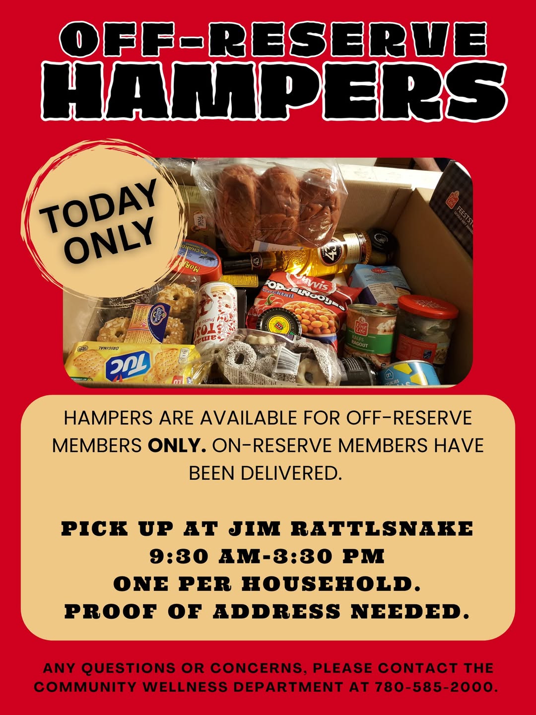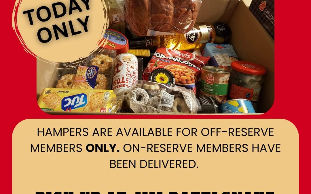 Hampers are available for off-reserve Ermineskin members to pick up at the Jim Rattlesnake Building today only from 9:30 AM to 3:30 PM. Deliveries have been made for on-reserve members. Limit one per household. Please provide proof of address.