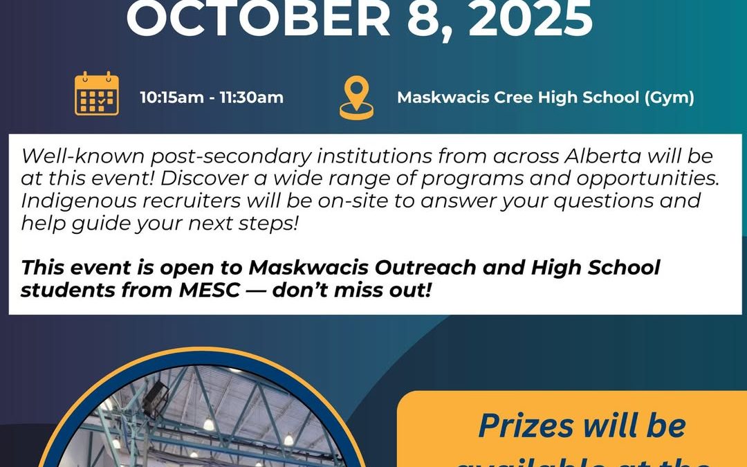 We’re hosting a Post-Secondary Fair at Maskwacis Cree High School on October 8, 2025 from 10:15 AM to 11:30 AM in the gym!