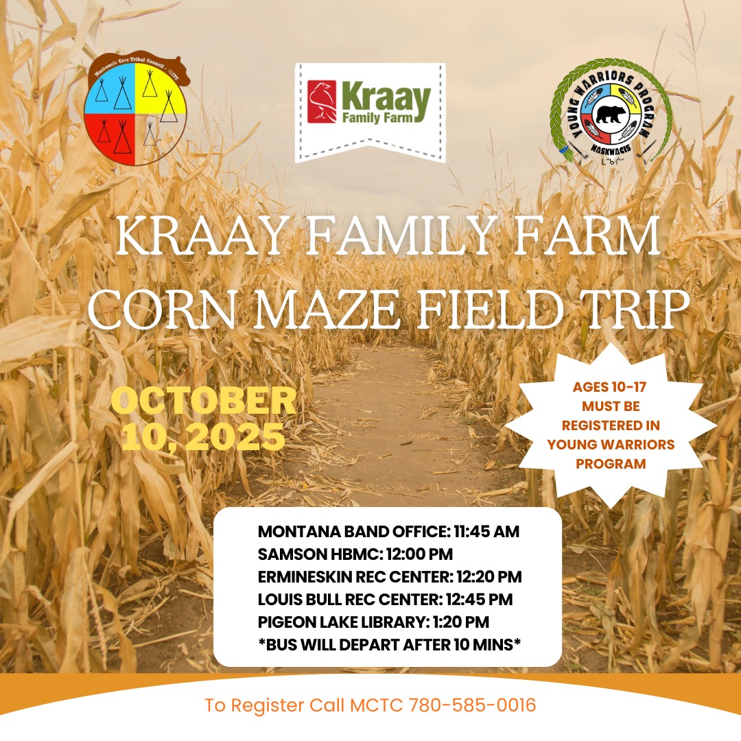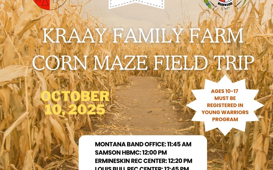 We’re excited to invite Maskwacis youth aged 10-17 to a fun field Corn Maze trip adventure at the Kraay Family Farm!
